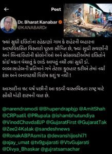 ડોક્ટર ભરત કાનાબારે ટ્વીટમાં લખ્યું છે, કે દલિતોના રહેઠાણો ગામ કે શહેરની બહારના અલ્પવિકસિત વિસ્તારો પૂરતા સીમિત છે. જ્યાં સુધી બિનદલિતોની કોલોનીઓ અને સોસાયટીઓમાં દલિતોને કોઈ મકાન વેચાતું કે ભાડે આપતું નથી, ત્યાં સુધી ડોક્ટર બાબાસાહેબની પ્રતિમાને ગમે તેટલા ફુલહાર કરીએ તેમાં નર્યા દંભ અને બનાવટથી વિશેષ કશું જ નથી. આઝાદીના 78 વર્ષ પછીની આ કડવી વાસ્તવિકતા રાષ્ટ્ર માટે સૌથી મોટી શરમની વાત હોવાનું ડોક્ટર કાનાબારે જણાવ્યું છે.
