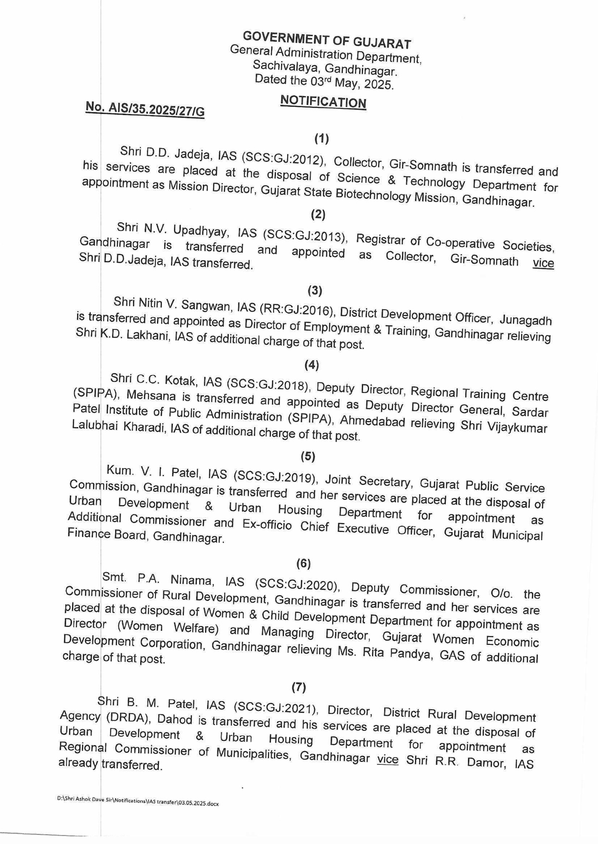 ડી.ડી. જાડેજા, જે અગાઉ ગીર સોમનાથના કલેક્ટર હતા, હવે તેઓ ગાંધીનગર સ્થિત સાયન્સ અને ટેકનોલોજી વિભાગના મિશન ડિરેક્ટર તરીકે નિયુક્ત કરવામાં આવ્યા છે.