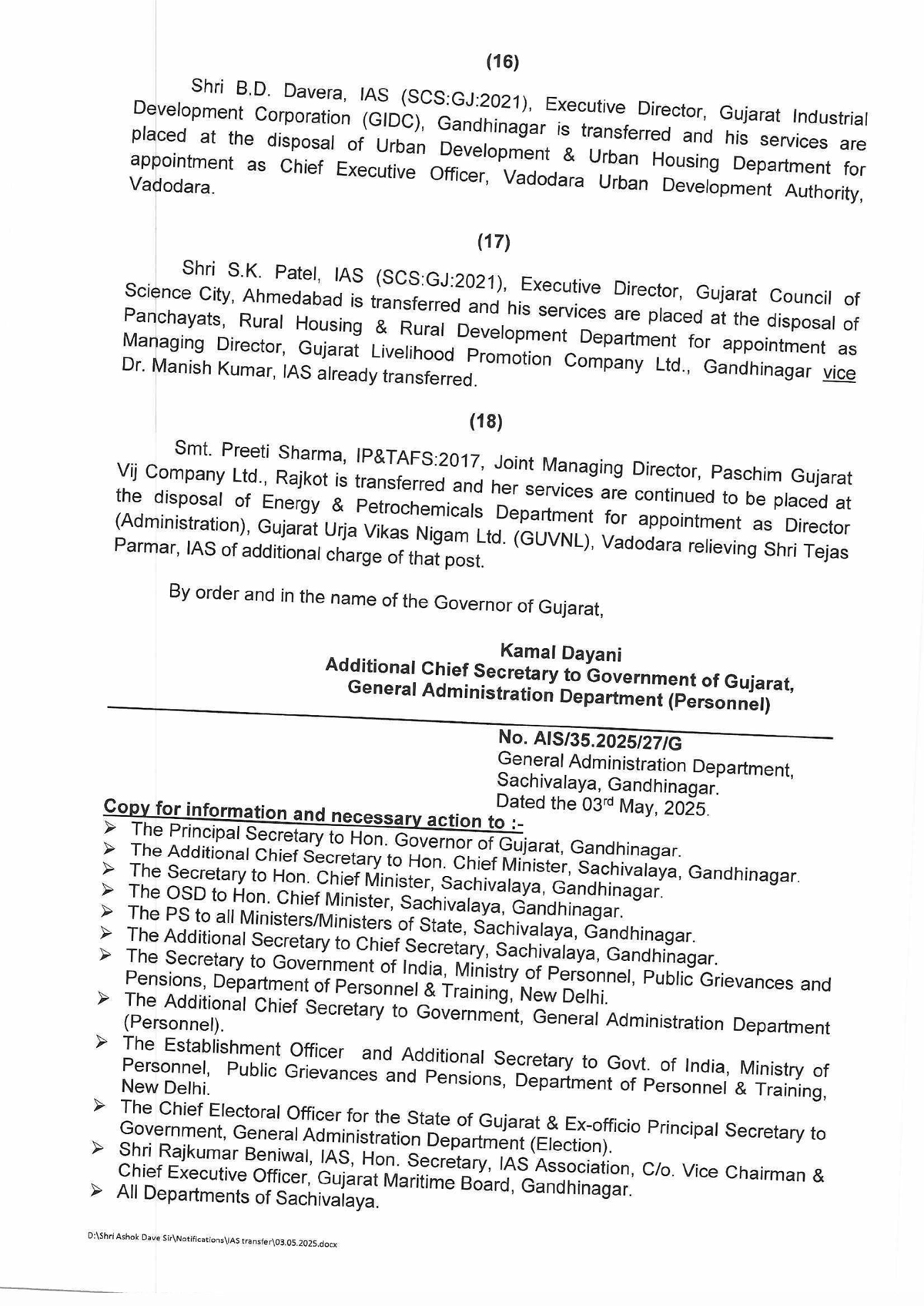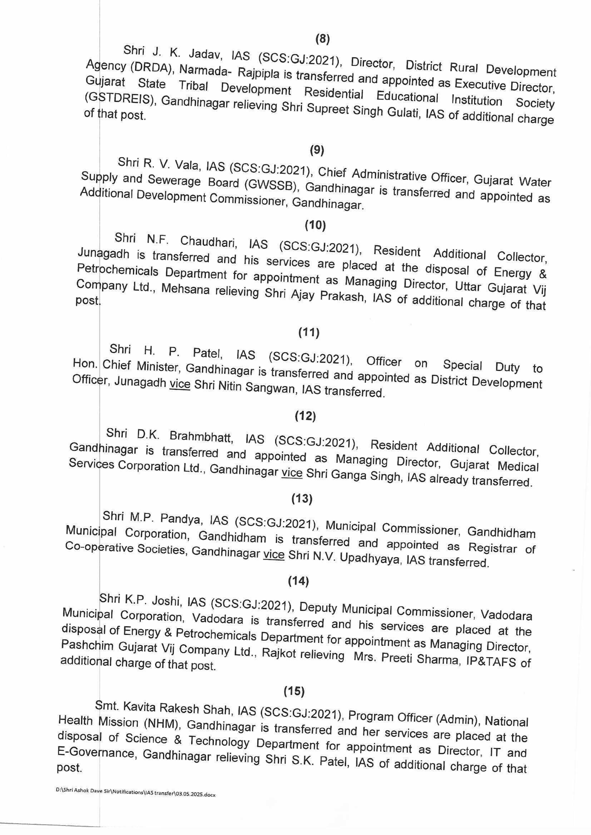 1 ફેબ્રુઆરી 2025ના રોજ રાજ્ય સરકારે એક સાથે 59 IAS અધિકારીઓની બદલી કરી હતી અને તેમાં 5 અધિકારીઓને વધારાના ચાર્જ આપ્યા હતા. તે બાદ 21 ફેબ્રુઆરીએ વધુ 2 અધિકારીઓનું સ્થાનાંતરણ કરવામાં આવ્યું હતું. એચ.જે. પ્રજાપતિ, સી.સી. કોટક સહિતના 20 અધિકારીઓને ત્યારે પ્રમોશન પણ મળ્યું હતું.