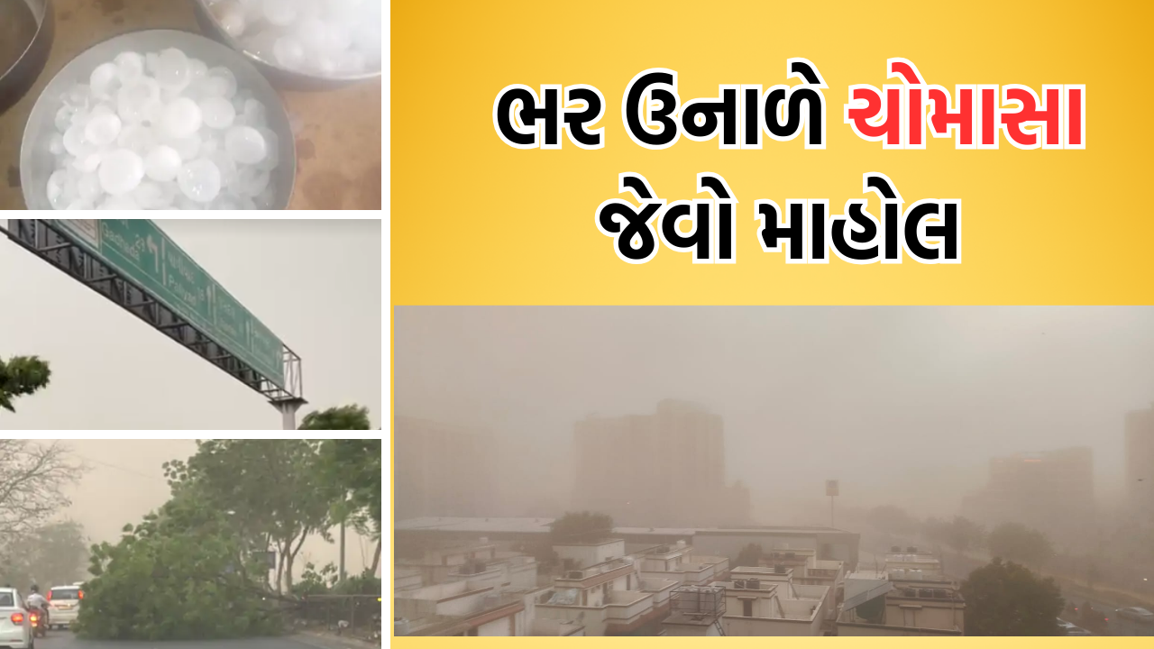 ખંભાત, રાપર અને અન્ય વિસ્તારમાં ધૂળના વંટોળ અને પાકનું નુકસાન:- ખંભાતમાં 40 કિ.મી.ની ઝડપે પવન ફૂંકાયો હતો તો રાપર તાલુકાના ધોળાવીરા સહિતના વિસ્તારોમાં કરાના વરસાદથી ખેડૂતો પાક સુરક્ષા અંગે ચિંતિત થયા.