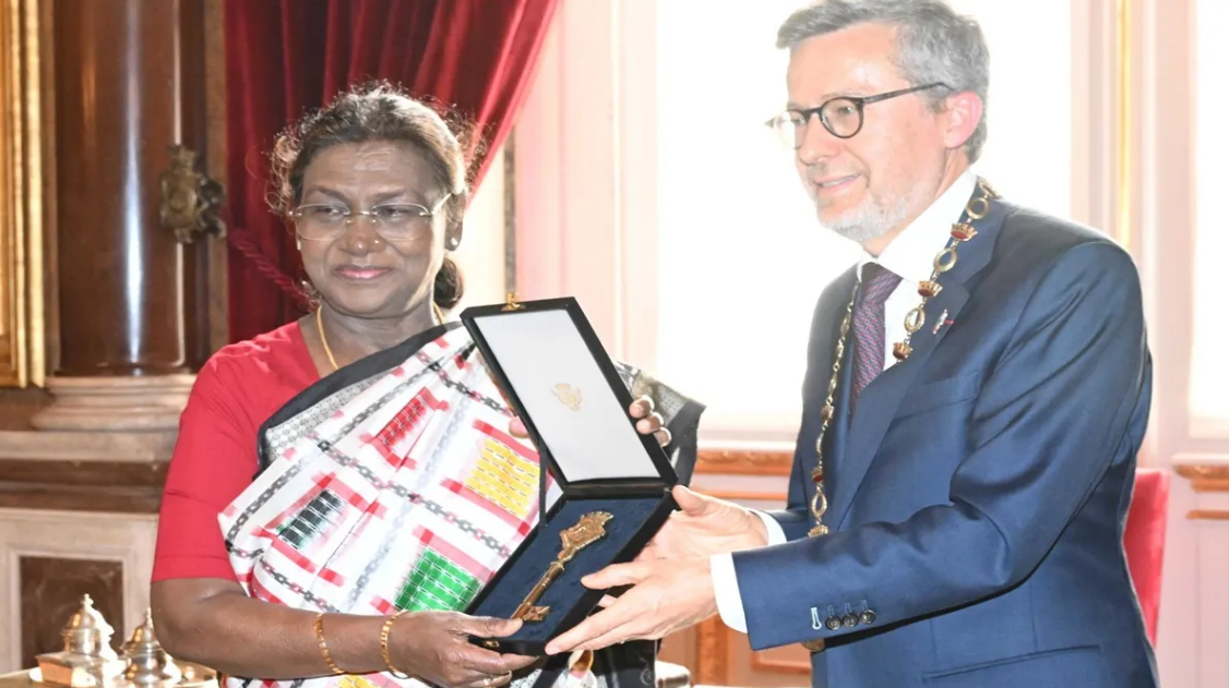રાષ્ટ્રપતિ દ્રૌપદી મુર્મુ પોર્ટુગલની બે દિવસીય રાજકીય મુલાકાતે પહોંચ્યા છે. તેમણે રાજધાની લિસ્બનમાં ‘સિટી કી ઓફ ઓનર’થી સન્માનિત કરવામાં આવ્યા હતા. લિસ્બનના મેયર કાર્લોસ મોએડાસે એક ખાસ સમારોહમાં તેમને આ સન્માન અર્પણ કર્યું. રાષ્ટ્રપતિ મુર્મુની મુલાકાત દરમિયાન, તેમને કામારા મ્યુનિસિપલ ડી લિસ્બોઆ ખાતે ગાર્ડ ઓફ ઓનર આપવામાં આવ્યું હતું, જ્યાં ભારતીય સમુદાયના લોકોથી ખીચોખીચ ભરેલા હોલની સામે તેમને સન્માન આપવામાં આવ્યું હતું.